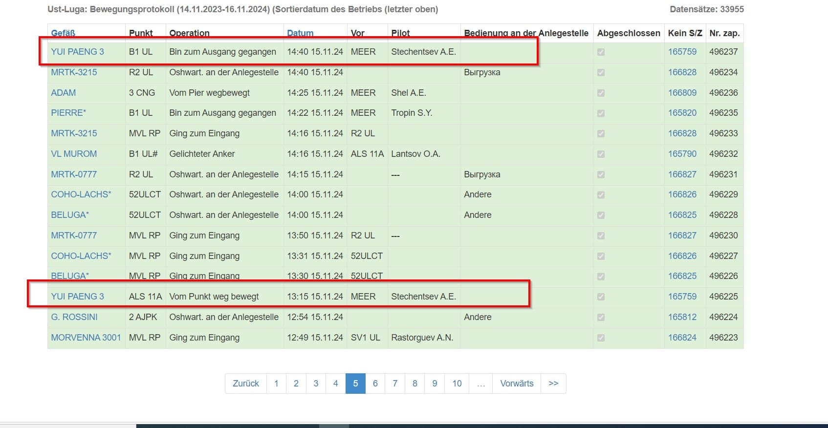 And so the logs for the ship ЮИ ПЕНГ 3 (№ 165759) passing through Ust-Luga (UL) are available at: http://skap.pasp.ru/Move/InOutMoveList/165759?harb=UL